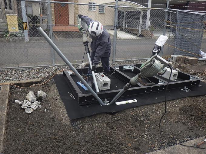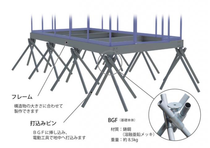 この「野立てキュービクル用スパイクフレーム工法」は、BGF金具を介して4本の鋼管を土中に打ち込み、キュービクルにあわせて製作されたフレームを取り付けるだけで基礎が完成します。あとはキュービクルを取り付けるだけで施工完了です。