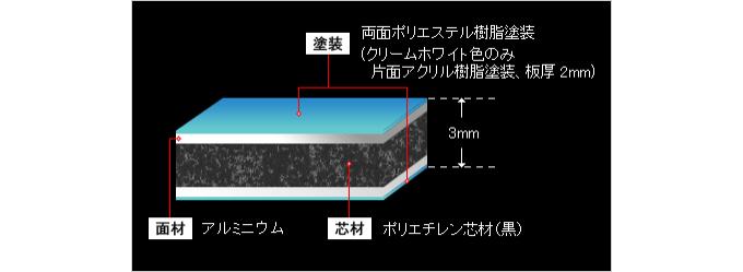 アルポリック®は表面にアルミニウム、芯材に樹脂を使用した3層構造からなるアルミ樹脂複合板です。