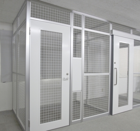 基本パネル割付けは1000Wで、ドア開口寸法が大きく、倉庫などオフィス以外で幅広くご利用頂けるパーティションです。また、パネル面だけでなく、柱等のアルミフレーム部に対する別注カラー対応も可能な一味違ったアルミパーティションとなっております。