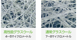 グラスウールは、繊維が複雑に絡み合うことで空気の部屋を作り出しており、この空気の部屋を層として構成することで、優れた断熱性能を発揮します。高性能グラスウールは通常のグラスウールよりも細く、繊維径4~5マイクロメートルで製造されています。
