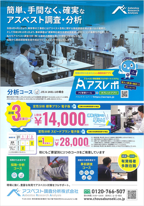是非アスベスト調査をお考えの方は、この機会にお問い合わせくださいませ。