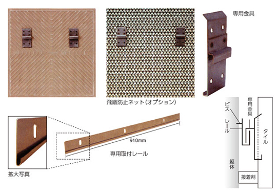 専用取付レールを構造体にビズ・アンカー等で留め付け、予め工場にて取付た専用支持金具付タイルをガチレールに引っ掛け、接着剤で固定する施工方法です。