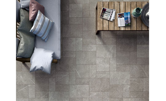 ■古代の石が持つ自然な表情と歴史ある佇まいを、最新技術により再現した磁器タイルです。上品なフロアを内外問わず実現できます。