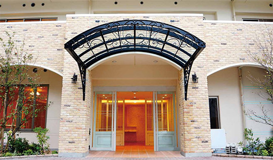 意匠性と機能性を兼ね備えたロートアルミ製キャノピーはファサードを彩る重要な要素です。ロートアイアンとガラスで構成する従来の方法だと重量が嵩み、建築躯体に大きな負担を掛けてしまうところ、アルミフレームとガラスポリカで構成することで大きく重量を軽減する事が可能です。