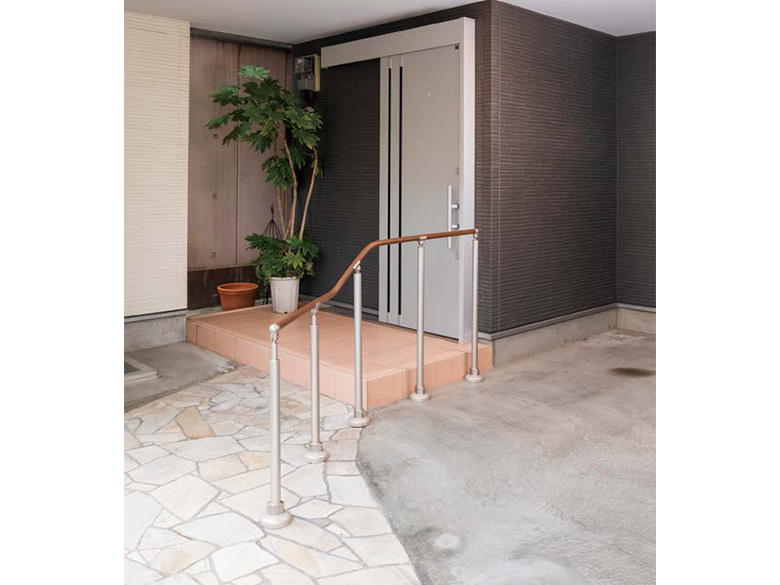 手すり棒は握りやすい太さのφ34mm。手に優しい樹脂被膜で、夏は熱くなりすぎず冬は冷たくなりすぎません。また、身体状況にあわせて手すりの高さを調整することが可能です。