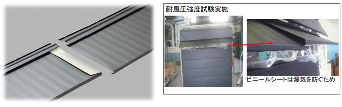 当社の金属屋根材「リファーナ」「エテルナ」は、特殊なハゼ篏合により、屋根全体が一体となって、耐風圧性能を有しており、圧倒的設計強度を誇っています。