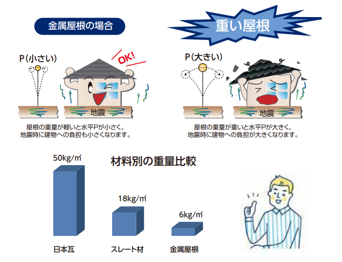 実は全く逆です。屋根が重いと、建物全体の重心は高くなり、地震で横揺れを受けた時の揺れ幅は大きくなります。