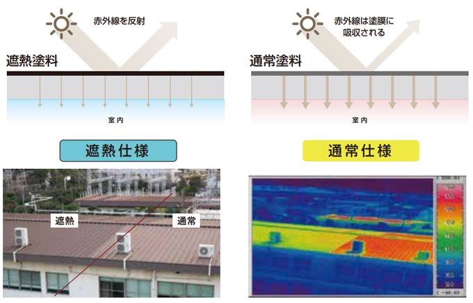 当社屋根材の鋼板は全て遮熱鋼板を使用しています。鋼板の温度上昇を約10%抑制します。