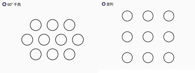 パンチングメタルには配列によって目方向があり、また、加工する板の大きさやパンチングの配列、金型により額縁(余白)の寸法が異なります。一般的には千鳥と呼ばれる配列が用いられますが、様々な用途やニーズに応じた加工を選択いただけます。
