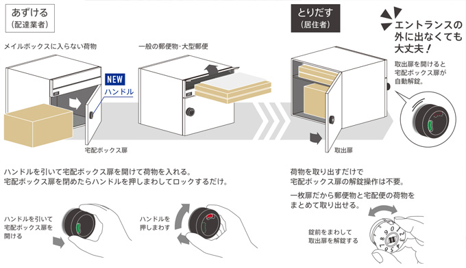 ①郵便物と宅配物をまとめて取り出し、取り出した後の解錠操作が不要