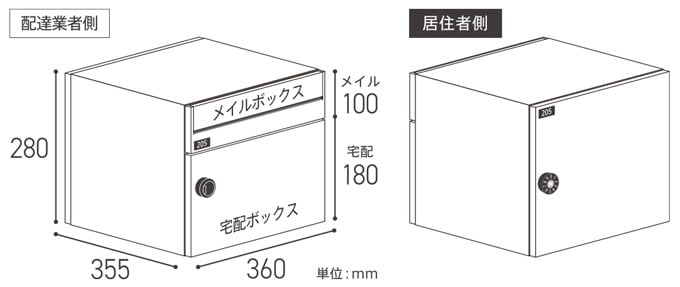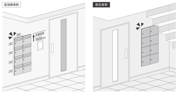 2024年に発売した前入前出・住戸別宅配メイルボックス「GMX-1」と同様に本体高さを280mmとし、三辺70cmまでの荷物を収納できるサイズを確保するとともに納まりの施工性に配慮しました。