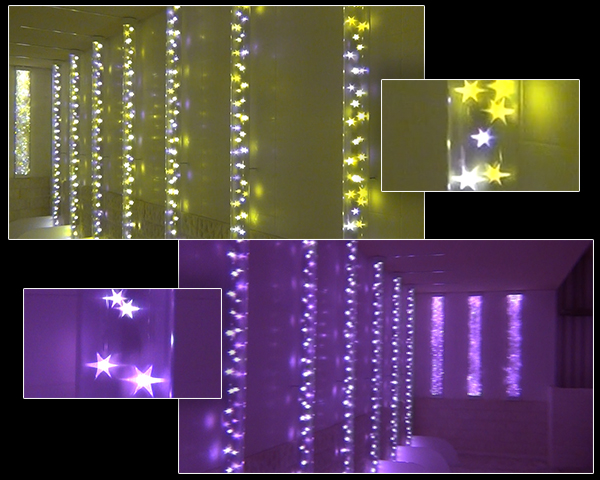 お風呂の床面に埋め込まれた光ファイバーの光点がひとつ、ひとつ点滅しながら色変化して行きます。お湯の揺らぎで光がゆらゆら広がって幻想的な雰囲気です。