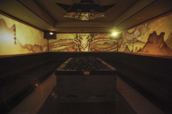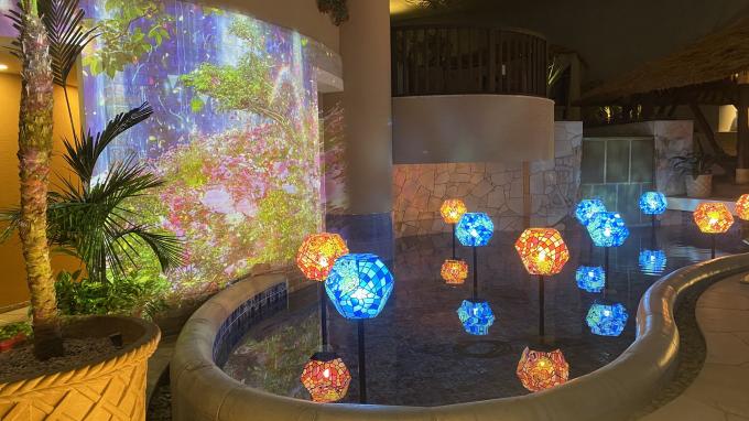 株式会社ミューでは、露天風呂や室内浴場、岩盤浴、お休み処などの壁や天井、窓、ローリュ窯等にプロジェクションマッピングや光や音の演出をします。