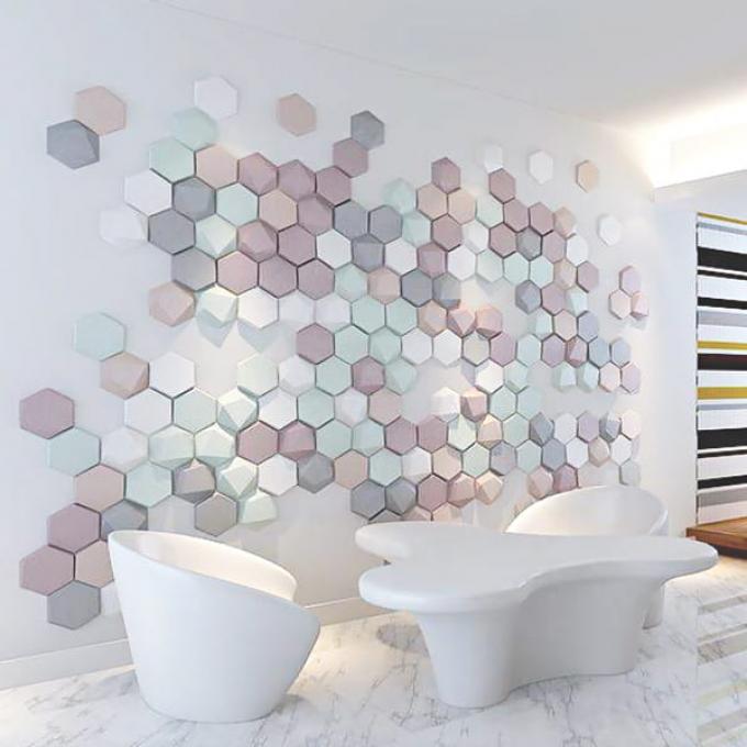 六角形にカットしたポリウレタン素材にカラーラッピングを施したカラフルな新タイプの装飾パネルです。