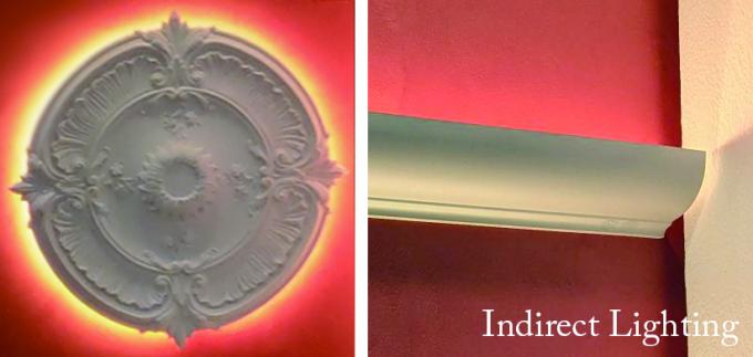 間接照明を用いたモールディングとメダリオンの展示と施工事例のパネル展示を行います。
