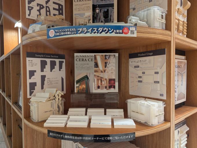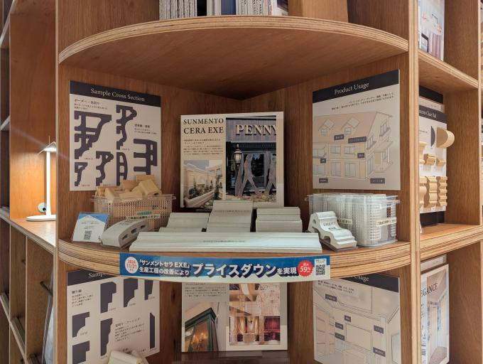 普段ショールームでしかご覧いただけないモールディングの代名詞にもなっている「サンメント」や「PU製エレガンス」、窯業系の外装用不燃材の「サンメントセラ EXE」、内装用不燃材の「サンメントセラCE」を展示しています。