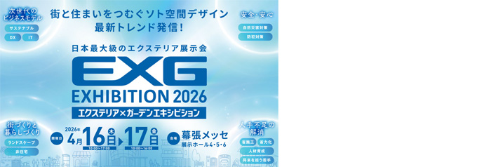 「第19回 エクステリア×ガーデンエキシビション(EXG) 2026」が2026年 4月16日(木)~17日(金)の2日間、幕張メッセ ホール4・5・6にて開催されます。