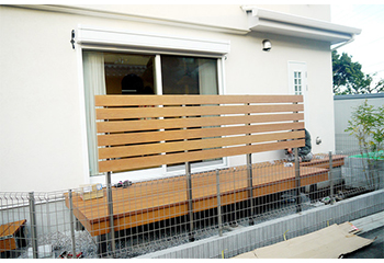 下の写真は庭が道路に面している例です。この配置では、まずリビング空間のプライバシーの保護が気になります。目隠しをウッドデッキと一緒に設置することで、家族の活動領域も広げられる「一石二鳥」な例です。