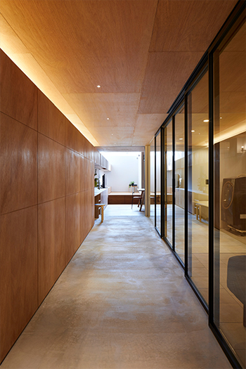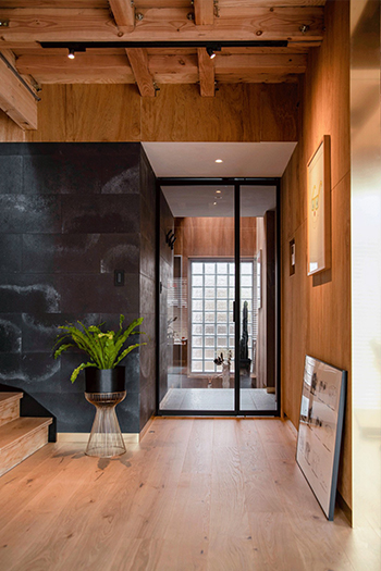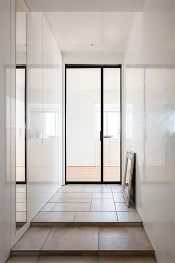 近ごろのガラス建具では、強度上は必要なくても、あえて横方向の桟をアクセントとして入れる格子状のデザインが人気。そこで《クアドロスリム》でも、引戸、開き戸、FIXの全タイプで横桟を入れるタイプを選べるようにしました。ガラスの種類は、横桟が美しく際立つクリアガラスのみ対応します。