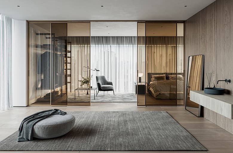 16mmのフレームにガラスをはめ込んだミニマルデザインは、空間につながりを生み出し、遮蔽するものが何もないという上質な空気感を醸し出します。フレームカラーはブラックとホワイト、新色のブロンズを加え3色、ガラスタイプはノーマルとリブの2色から選べます。