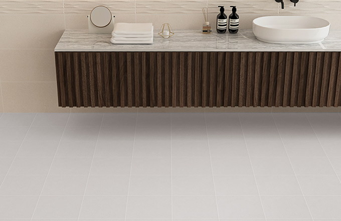 《マイネ》は、主張しすぎないベーシックな色とテクスチャーが特長の単色タイルです。滑り止め効果も高いため、洗面所やランドリースペースといった水周りに最適です。
