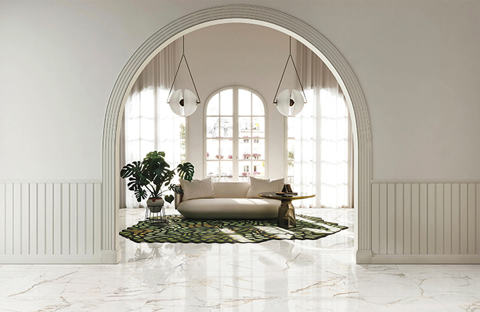 《マルマー》は、世界的に人気の高い白大理石を再現したタイルです。優れた磨き技術により生まれる鮮やかな光沢と、シルクのような滑らかな手触りが高級感を引き立てます。