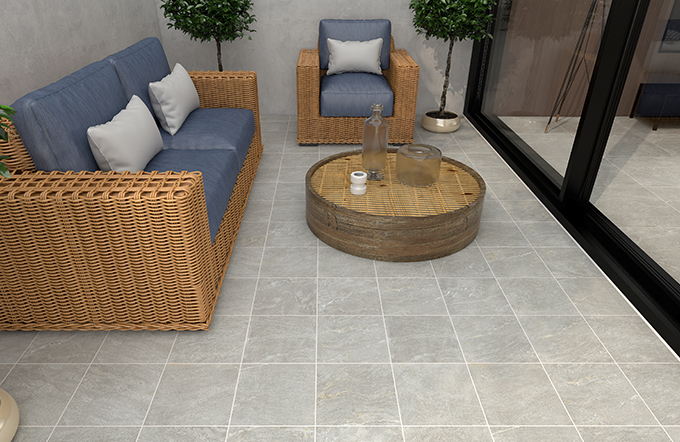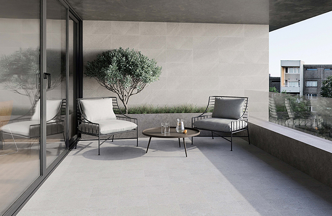 《デイト》は、屋外や水周りに安心して使える最高水準の滑り止め効果を誇るタイルです。グレーのシックな佇まいで、屋外から屋内までのトータルコーディネートが可能です。