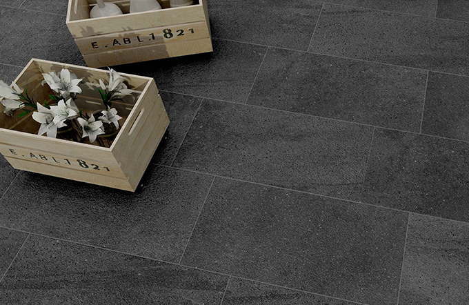 《アパッチ》は、バサルト(玄武岩)をモチーフにしたストーン調タイルです。0.5%以下の吸水率で防滑性も平均値を超える、クールな石目が特長の磁器タイルです。