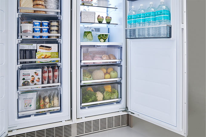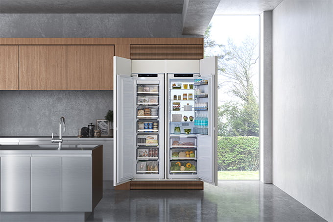 《インヴィエラ ビルトイン冷蔵庫》は、空間に溶け込むノイズレスな外観と、一般家庭でも導入しやすい価格帯を両立したモデルです。冷凍冷蔵の2ドアタイプに加え、冷蔵庫と冷凍庫を独立して設置できるサイドバイサイドタイプも揃え、くらし方に合わせた柔軟な組み合わせが可能です。