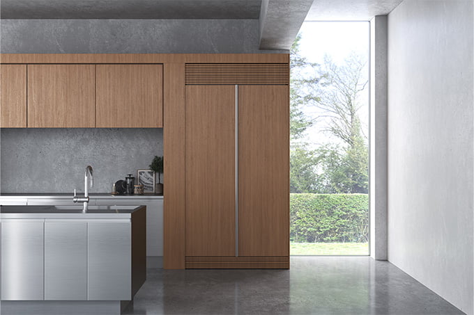 本製品はビルトイン冷蔵庫本体のみを提供する仕様としており、冷蔵庫扉を含む外側の面材(仕上げ材)は付属しておりません。外装デザインはすべて設置現場でご選定いただく形式のため、キッチン空間のテイストや設計コンセプトに合わせた最適な造作が可能です