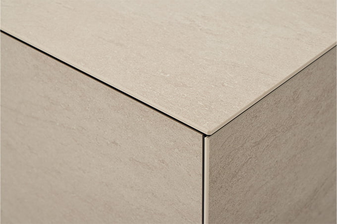 また、天板・扉・側板に使うセラミックの厚みを使い分けた独自構造を採用し、工場でほぼ完成した状態まで精密に仕上げることで、現場での特殊加工を一切不要にしました。さらに、大判タイルを全面に使用し、無駄な線や凹凸を排除することで、素材の質感が際立つミニマルな意匠を実現しました。