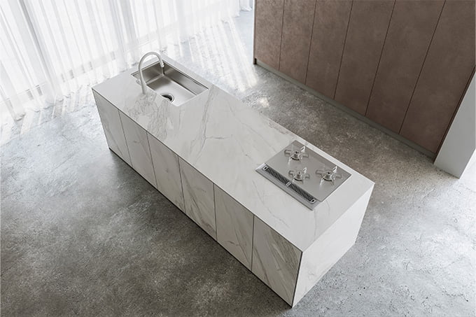 ワークトップ・扉・サイドパネルのすべてに同一のセラミック素材を使用。素材・色・質感が空間全体で統一されることで、まるでひとつの塊を切り出したような圧倒的な存在感を生み出します。キッチンそのものがインテリアの主役となる究極のノイズレスを追求しました。