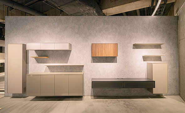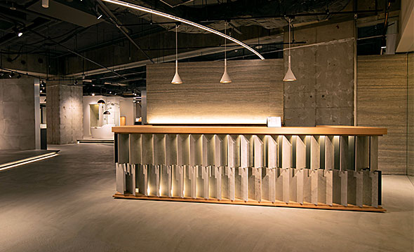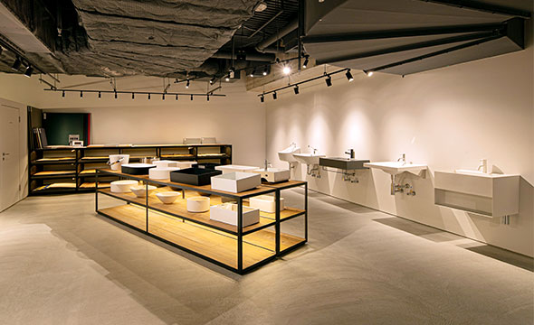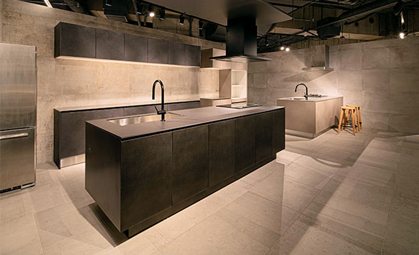新しいショールームでは、8月発売予定のシステムキッチンなどの最新アイテムを展示するだけでなく、地元福岡の自然素材である甘木の赤土を用いた土壁、有明海で取れた古代貝灰を用いた漆喰などを仕上げ材として使用することで、地域性と歴史を感じられる空間となっております。