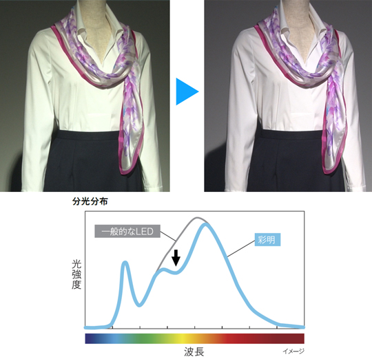 「彩明」は、一般的なLEDに比べ、白色の白さを引き立て個々の色をより自然に再現し、黒や紺など判別のつきにくい色の差も引き出します。