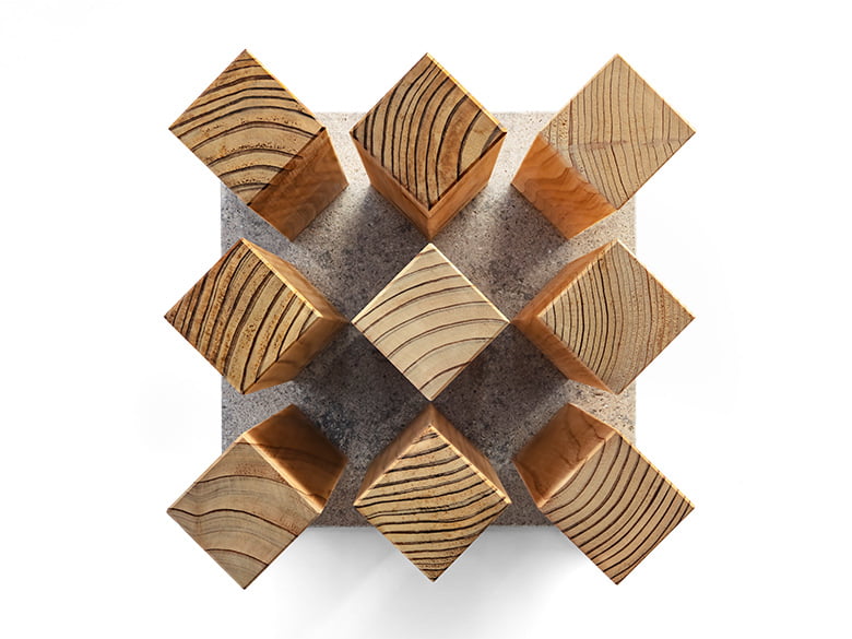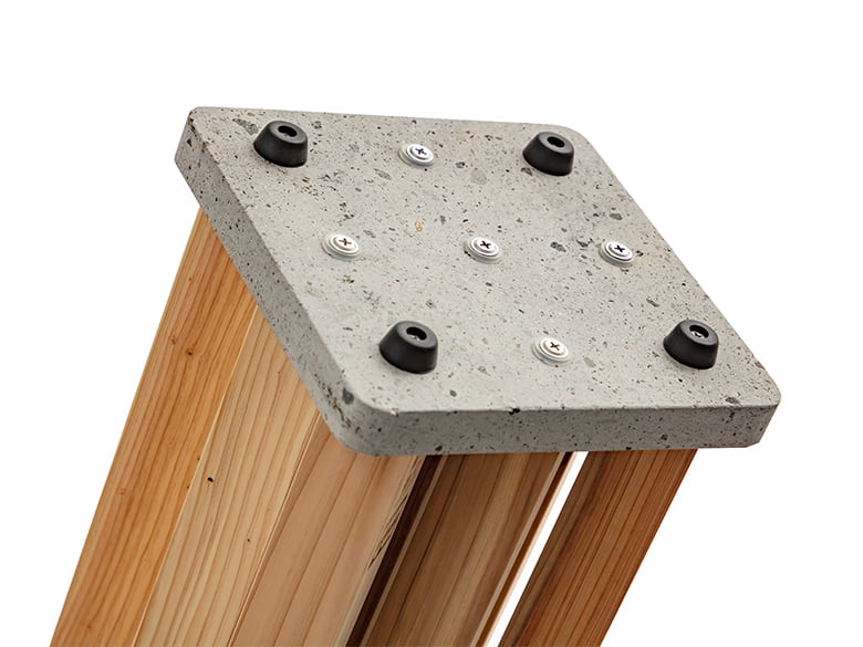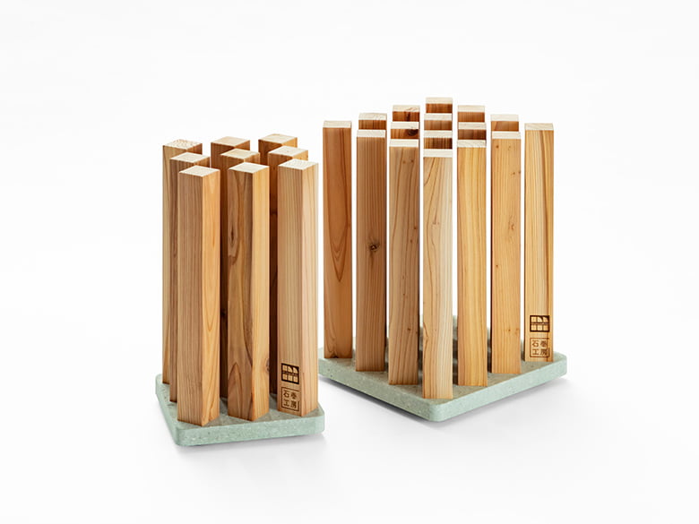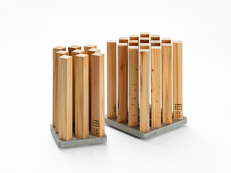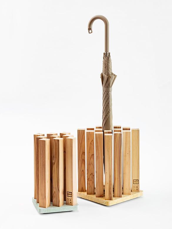 国産石のプレートに、2×2材(3.8×3.8㎝)の屋久島地杉材を規則正しく立てた、シンプルでユニークなデザインの傘立てです。住宅用としてはもちろん 2台、3台と連結することで、オフィスや商業施設でもご活用いただけます。