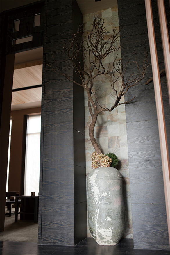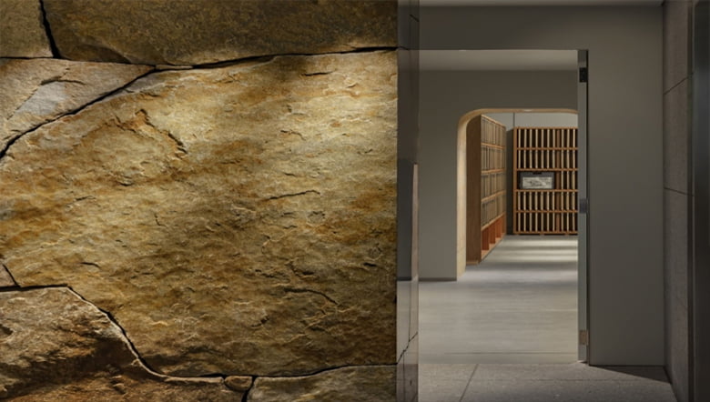 エントランスから「STONES lab」ゲートと室内を見通す。香川県産の庵治石の迫力ある壁面が来客者を出迎えてくれます。