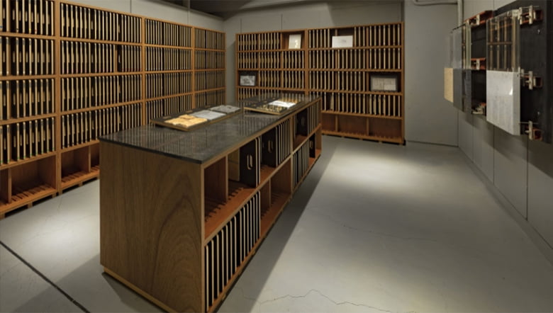 イタリア、インド、中国など世界中で産出された石のほか、銘石と呼ばれる国産石を合わせた約400種類の石をパネルに収録し、書架のように収納しています。