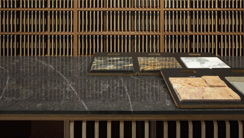 水磨きや本磨き、割り肌、バーナーなどさまざまな仕上げのサンプルを用意している石種もあり、それらは設計やデザインのアイデアを広げてくれます。