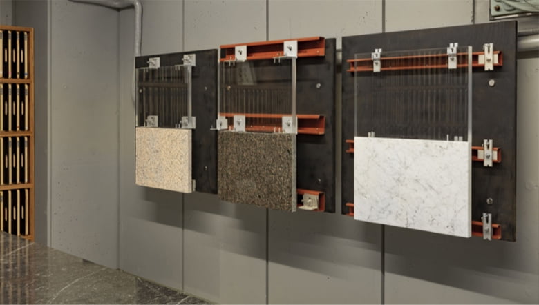 壁面に設置しているボードは、石貼りをする際の下地材や施工を説明するためのもの。工法の検討などにお役立ちできればとの思いから設置しました。