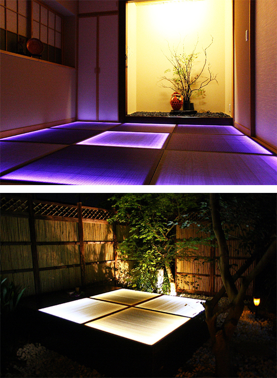 照明点灯時には、癒しと、リラクゼーション効果の空間演出として、又、照明消灯時には、従来の畳として、機能します。