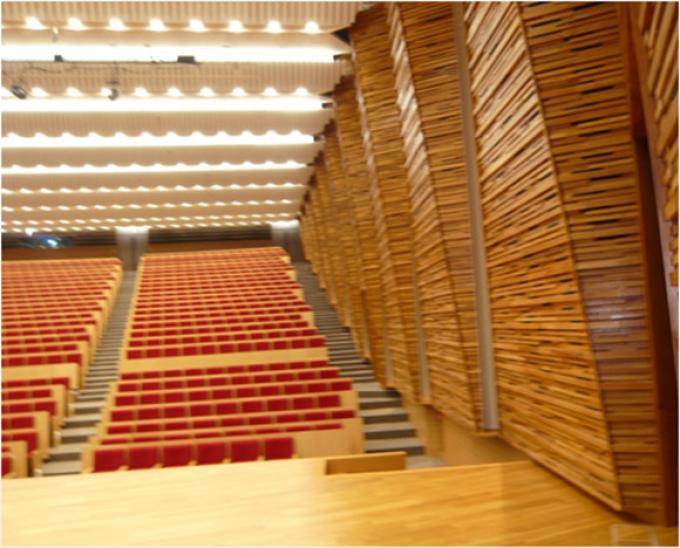 創価大学八王子新教育棟の1000人収容する多目的ホールの壁に