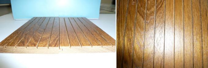 写真の通り、裏面に2mm幅の溝を5本切込み、表面積を増やし、保温効率を高めると共に、フローリングの両端が反って凹に見えないよう工夫をしています。