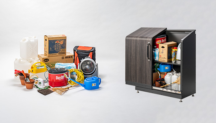 ■これまで置きたくても置けなかったスペースに向けて奥行を短くし、高さを出したサイズでラインナップ。スライド扉の特徴を活かすため高さを出した分、ワンタッチ棚(オプション)で上下に収納空間ができ、20Lのポリタンクやシーズン用品など使用用途によって収納方法を変えられます。