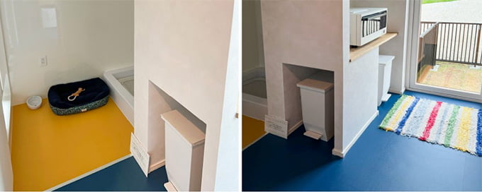 リビングは犬も人も一緒に過ごす空間のため、普段採用している無垢フローリングはなかなか使えません。