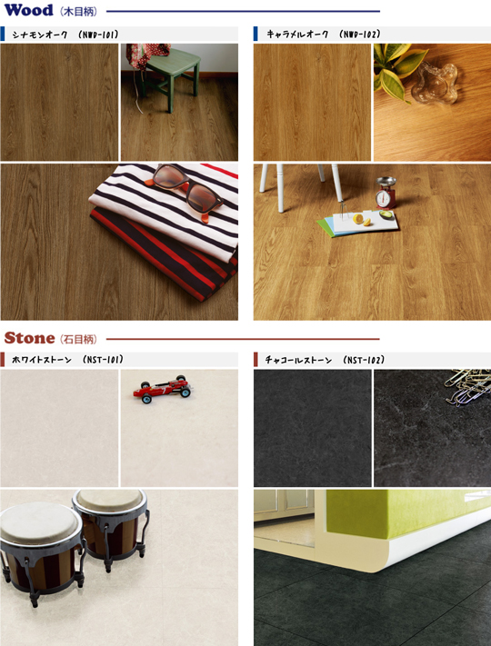 厳選された木目柄(ウッドシリーズ)に加え、インテリアの幅が広がる石目柄(ストーンシリーズ)が追加!シンプルな表情で、様々な場所にお使いいただけます。