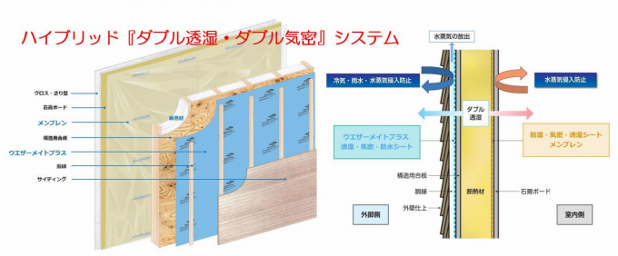 外壁に『ウエザーメイト・プラス』、内壁に『メンブレン』を使用し、夏期はウエザーメイト・プラスで外部からの湿気の侵入を阻止し、メンブレンで壁体の湿気を室内に透湿させ、夏型結露を防止する