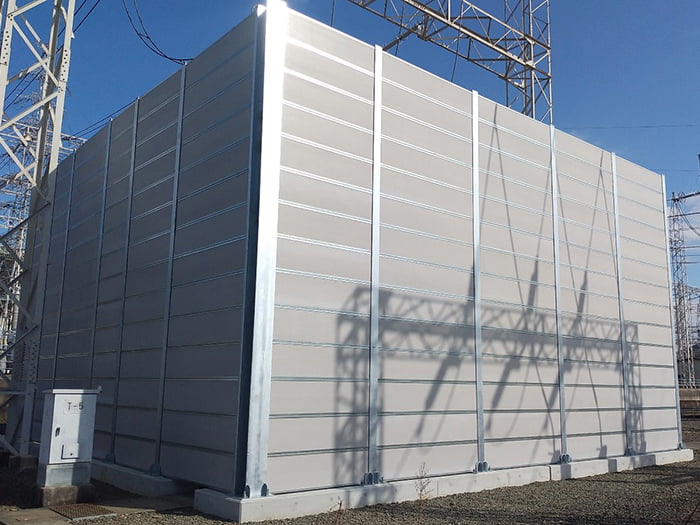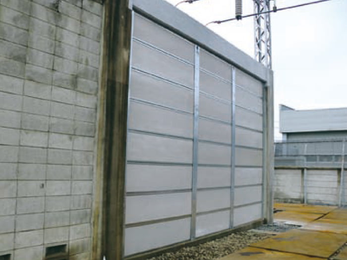 「ポアセル」と「耐水性ボード」を弾性系接着剤で複合させ、上下に補強材を取り付け、一体化させた「吸遮音パネル」です。ポアセルの優れた吸音性と、耐水性ボードにポアセルを複合することで高性能な遮音性を合わせ持ったパネルです。パネルの長辺に補強材(高耐食性亜鉛メッキ鋼板)を用いることで、風圧に耐える構造になっています。
