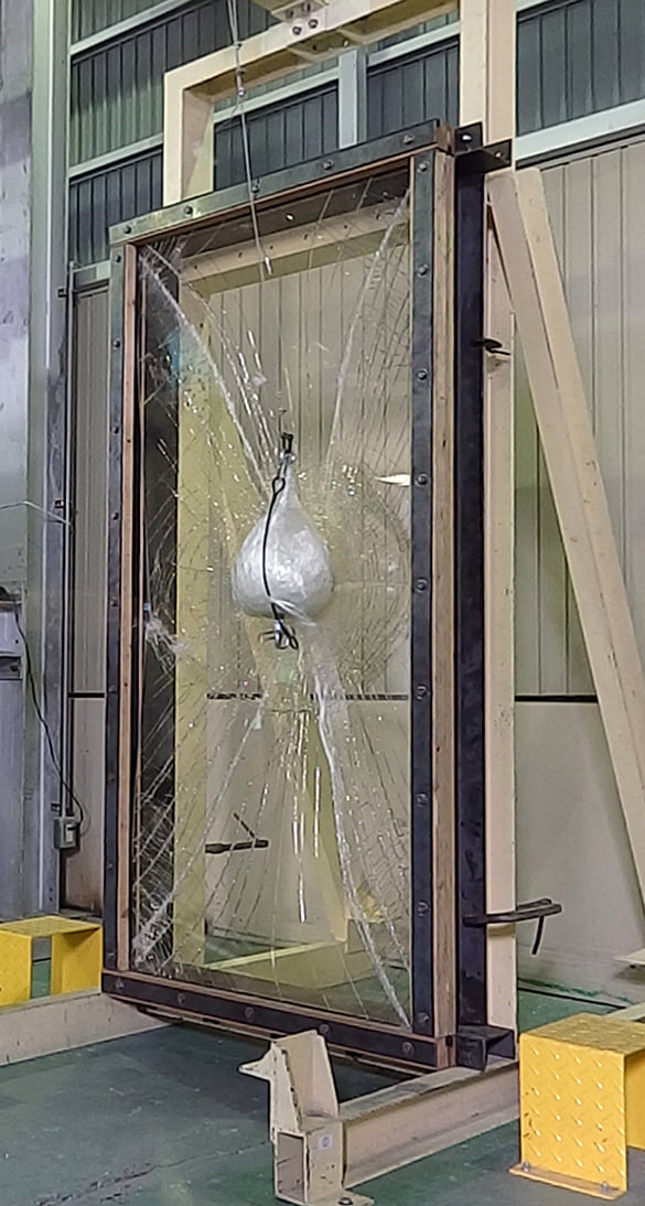 合わせガラスのため、万が一、人や物が衝突しても割れにくく、もし割れても破片の飛散や落下、脱落がほとんどありません。 「JIS R 3205合わせガラス」における耐衝撃試験の基準を満たしています。