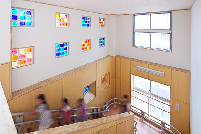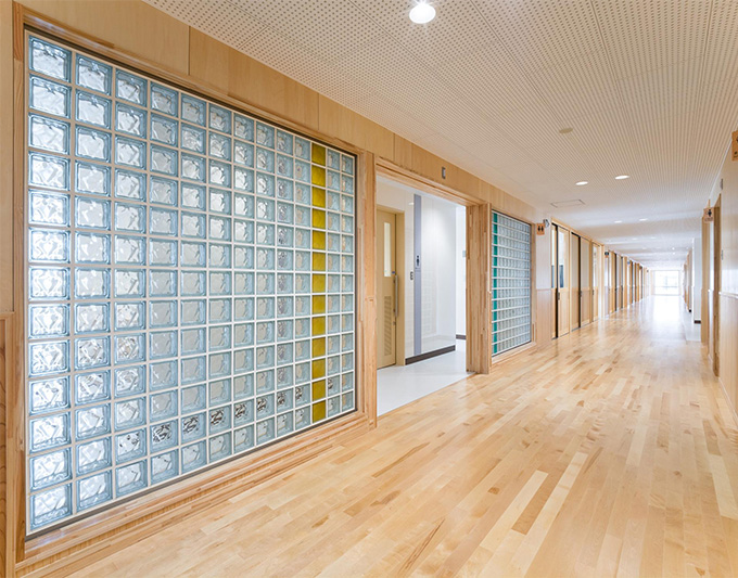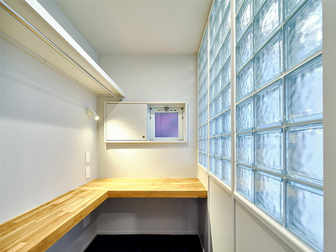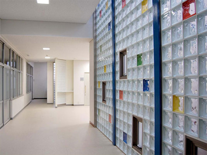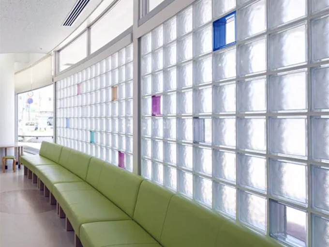 ガラスブロックで構成された壁は、光を透し、音を和らげ、視線をコントロールするなど、明るく心地いい室内空間をつくります。