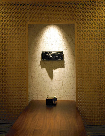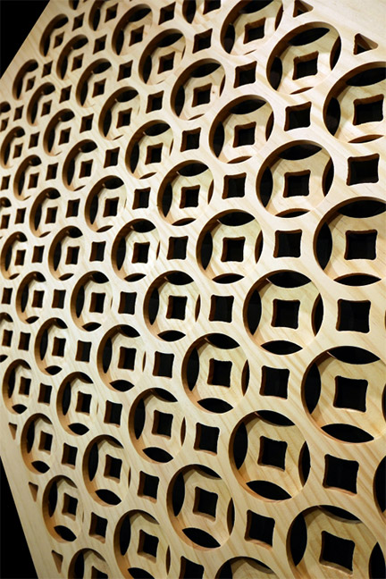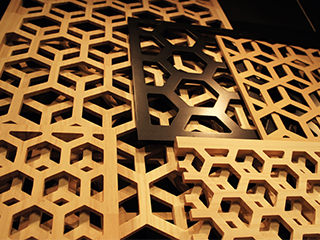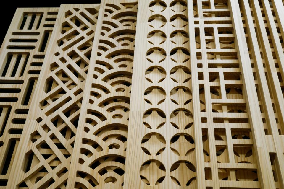 天然木無垢集成材を表裏両面から切削加工を行い、一枚ものとして仕上げた立体感のある組子風格子パネル